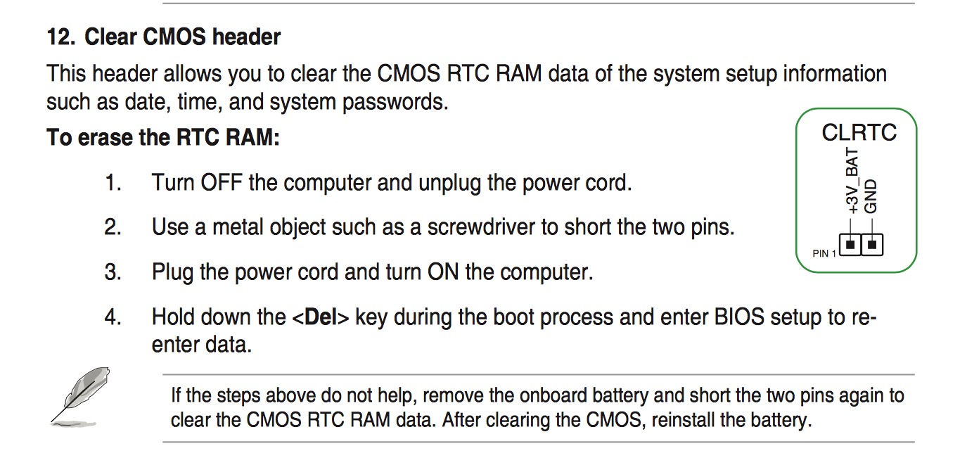 Basically, grab a screwdriver and place it so that it contacts both terminals (CLRTC pin) at the same time, then hold it for a couple of minutes. After that, plug the power cable, turn on the computer, and check whether the password has been cleared or not.